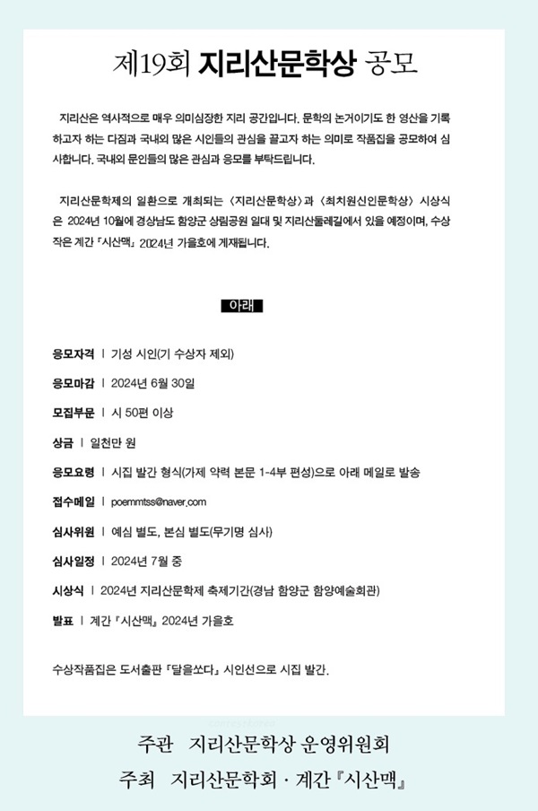 지리산문학제의 일환으로 개최되는 <지리산문학상><최치원신인문학상> 시상식은 202410월에 경상남도 함양군 상림공원 일대 및 지리산둘레길에서 있을 예정이며, 수상작은 계간 시산맥2024년 가을호에 게재됩니다.