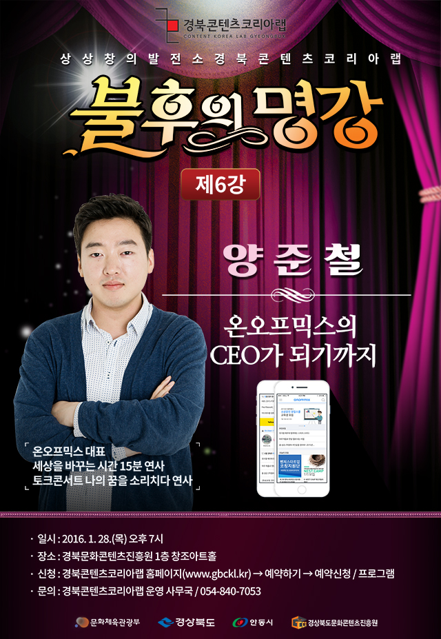 이러한 모임문화플랫폼을 개설한 양준철 CEO를 초청하여 경북문화콘텐츠진흥원 1층에서 무료특강이 진행되고, 선착순 50분에게는 사은품을 증정해드리니 많은 참여 부탁드립니다.